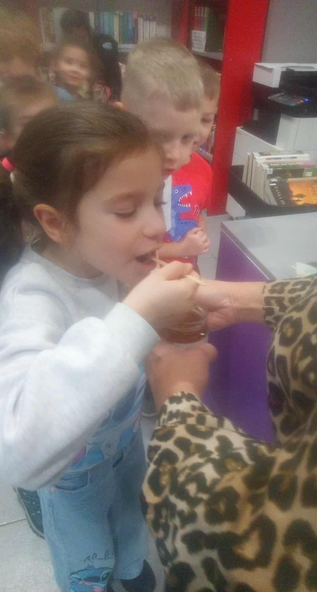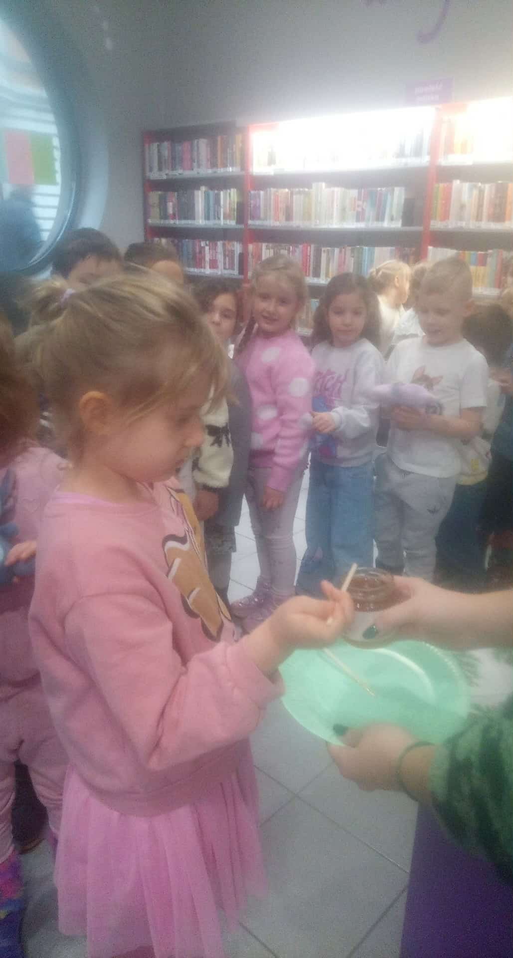 Dzieci od rana wybrały się na wycieczkę do Biblioteki, gdzie uczestniczyły w zajęciach o misiach. Kolorowały malowankę, próbowały miodu oraz bawiły się ze swoimi misiami. A to nie koniec atrakcji na dzisiaj.