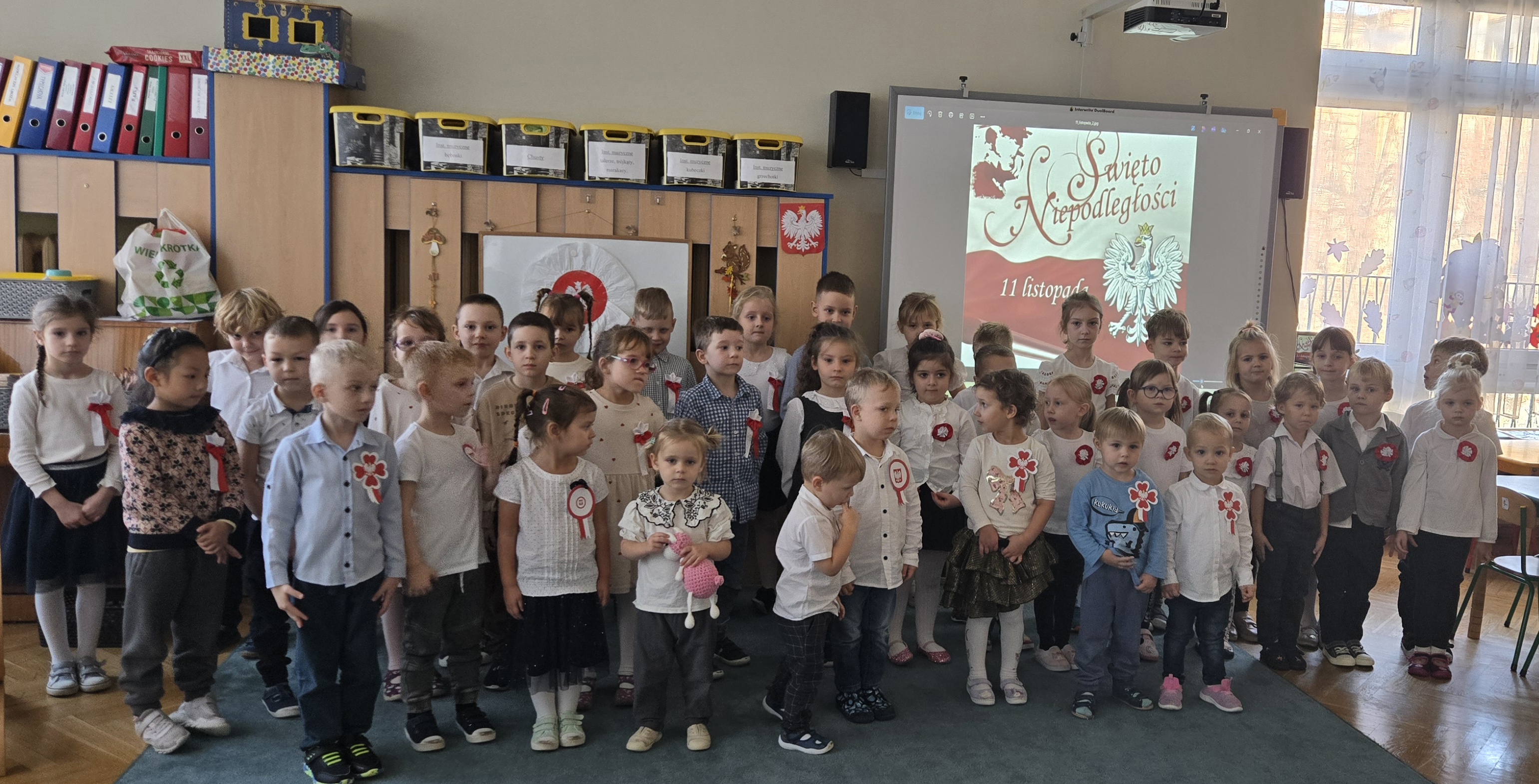 Nasze przedszkolaki stanęły do hymnu o 11.11. Wszystkie wyglądały bardzo poważnie i śpiewali hymn.