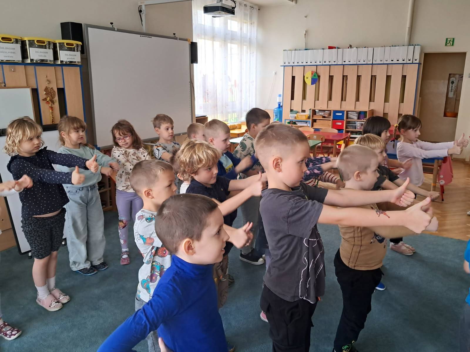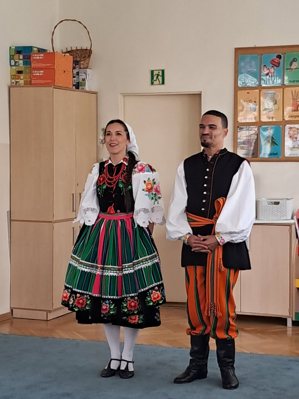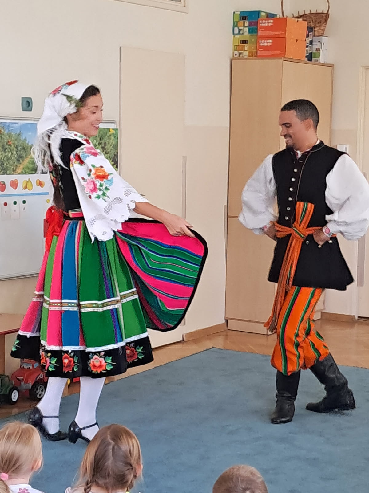 Uczestniczyliśmy w pokazie tańców narodowych wykonywanych przez profesjonalnych tancerzy. Pan Witek na spotkaniu z muzyką przybliżył nam historię i tradycję tańców polskich - oberka, kujawiaka, poloneza, krakowiaka i mazura. Dołączyły się również nasze przedszkolaki do tańca.