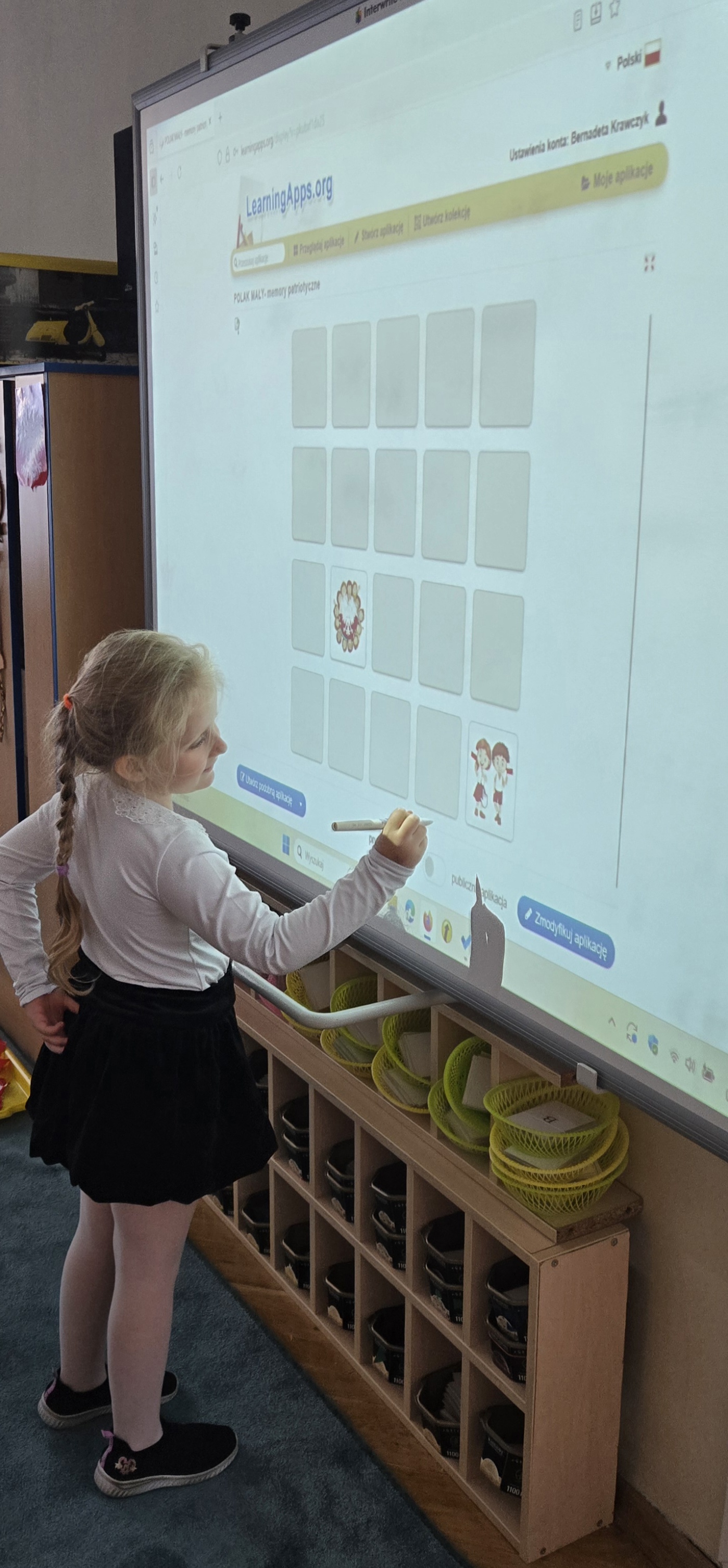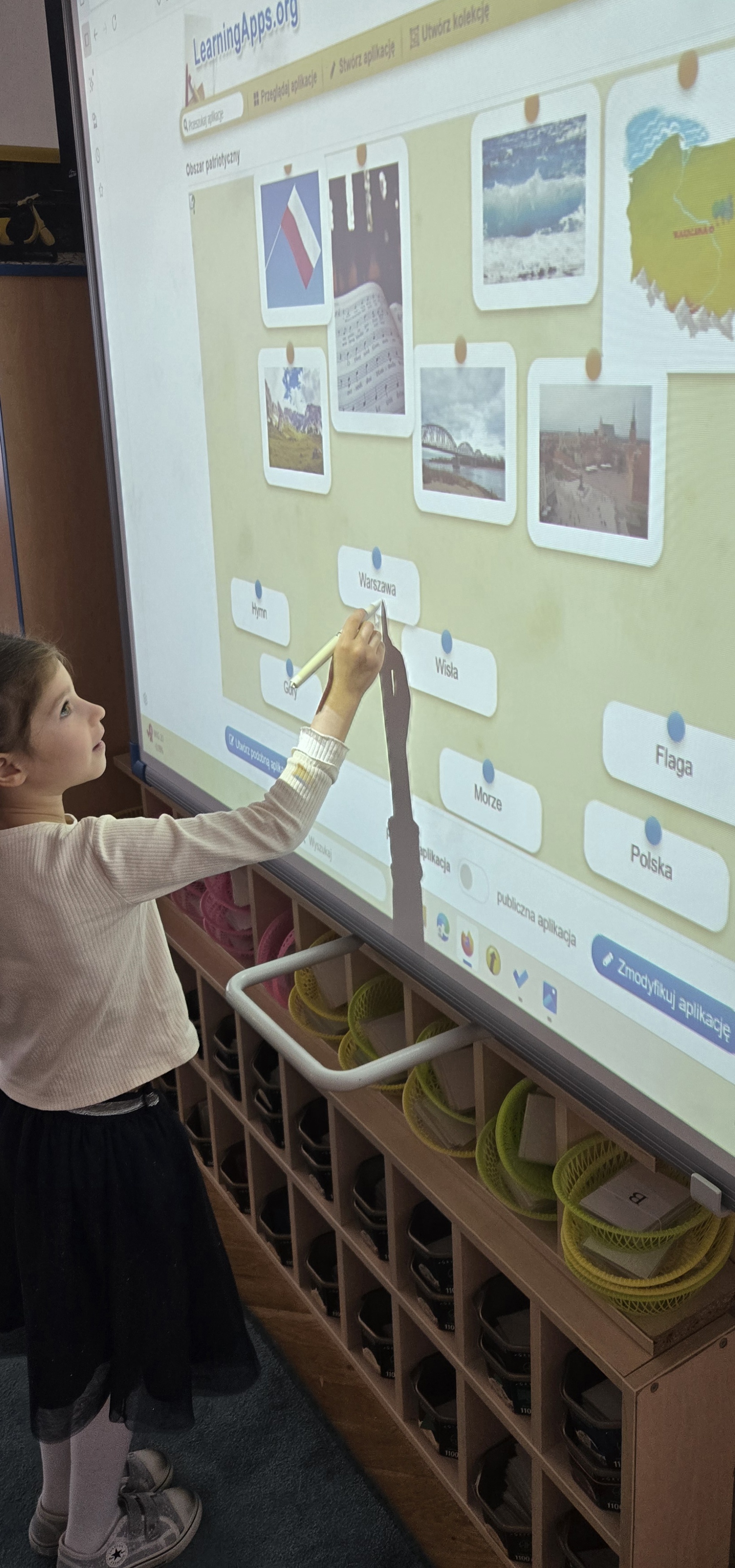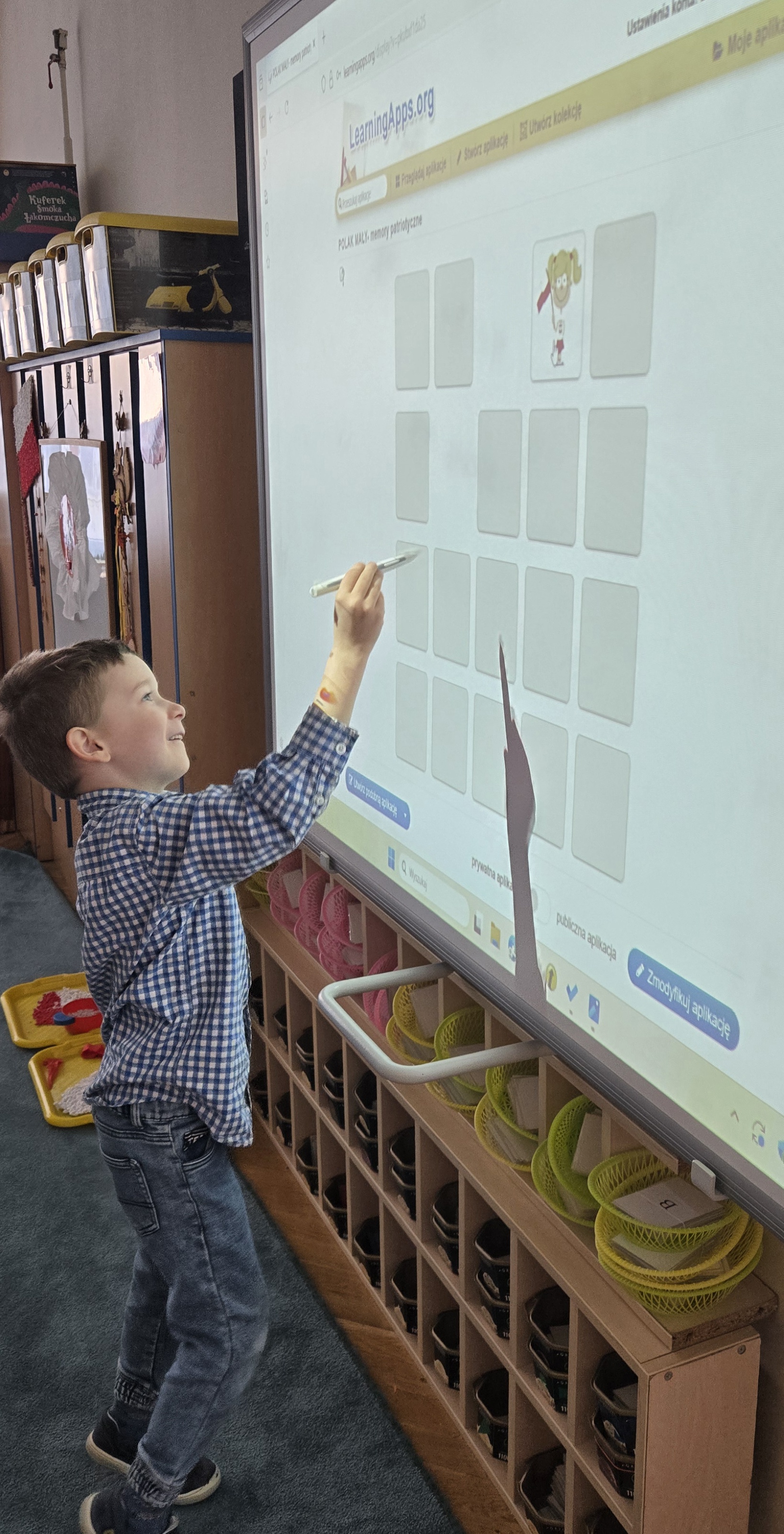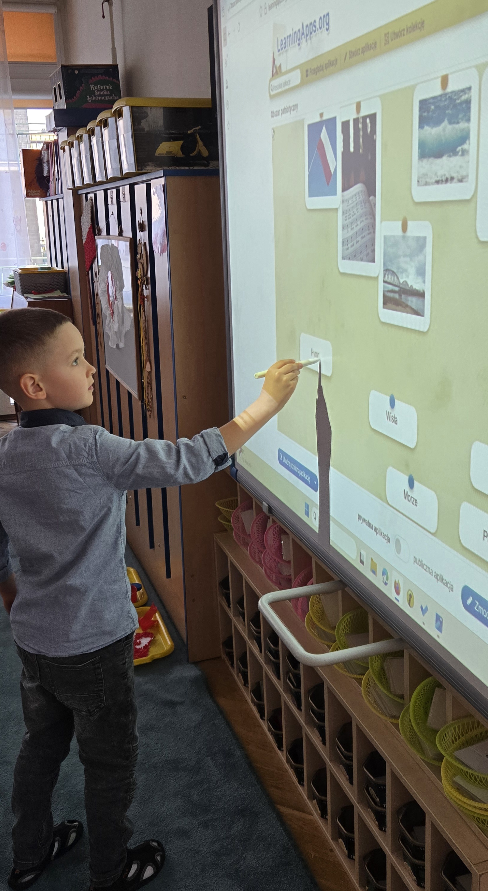 Dziś zakończyliśmy tydzień patriotyczny. Podsumowanie wiedzy zdobytej przez cały tydzień o pięknej Polsce odbyło się z użyciem tablicy multimedialnej i aplikacji LearningApps.